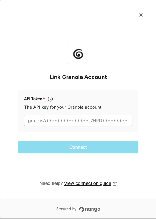 To authenticate with Granola, you will need:- API Key – Your Granola API key for authentication.