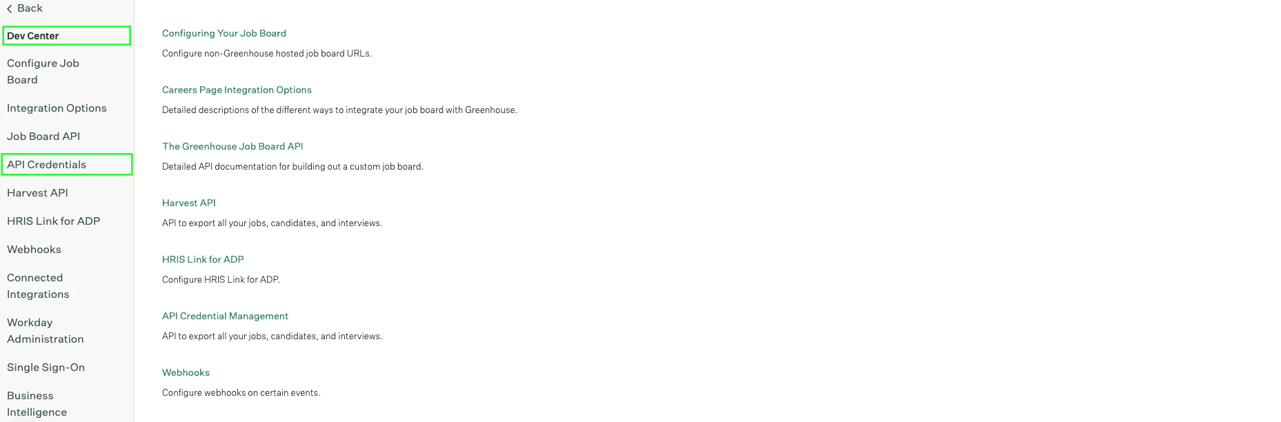 - Log in to your Greenhouse account and navigate to Dev Center > API Credentials.