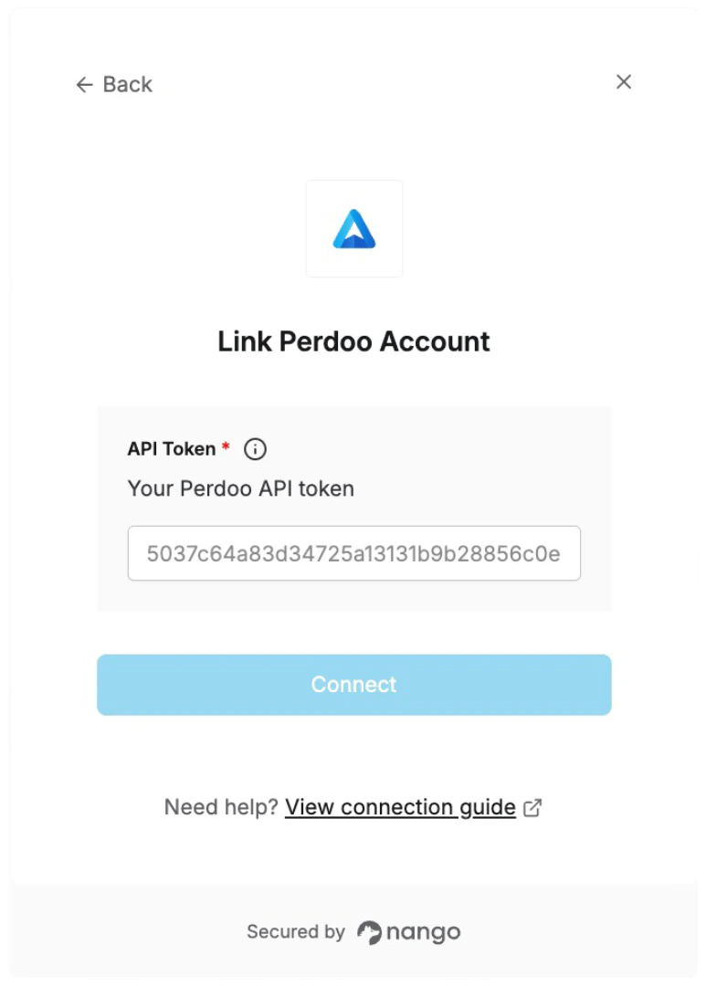 To authenticate with Perdoo, you will need:- API Token - A 64-character hexadecimal key that grants secure access to the Perdoo API, enabling authorized applications to interact with your OKRs, KPIs, and organizational data.