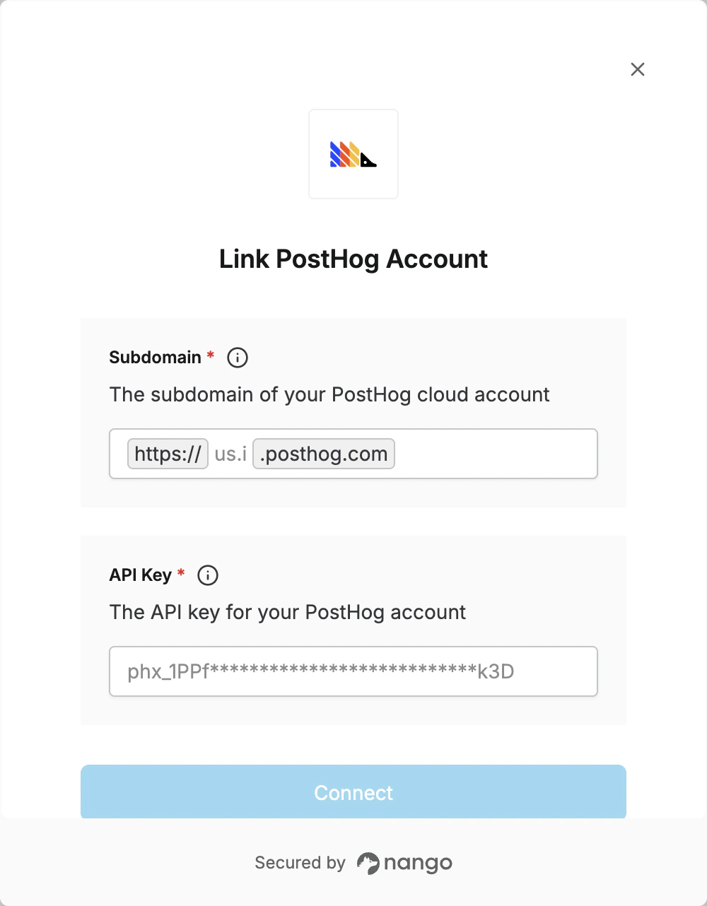 https://and before.posthog.com - API Key - A key that grants Nango permission to interact with PostHog’s APIs and services
