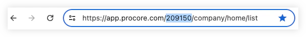https://app.procore.com/companies/598134325779301/projects- The company ID in this example is