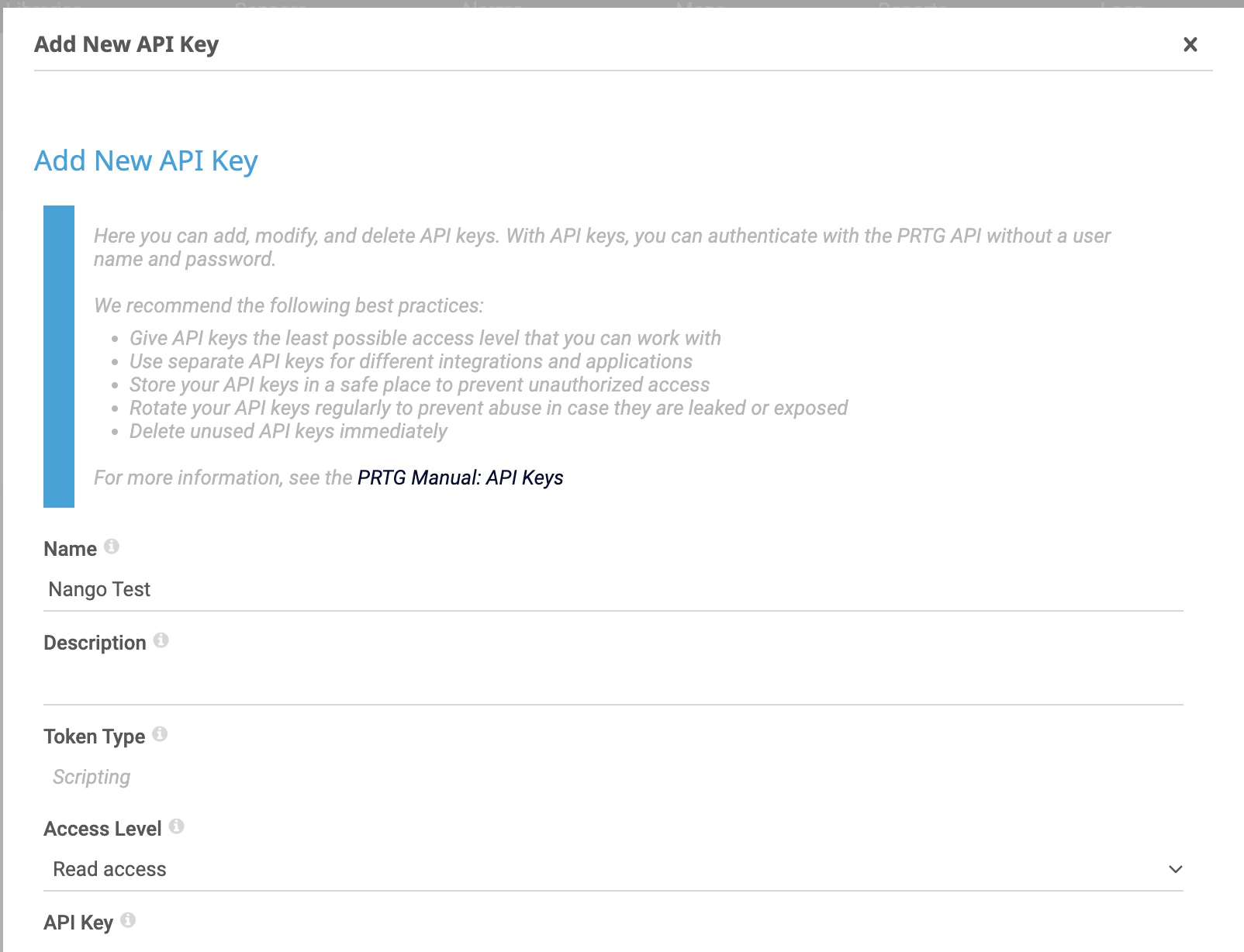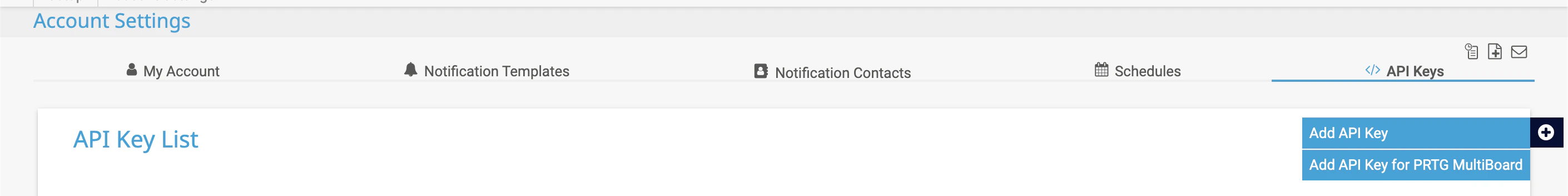 - In PRTG, go to Setup -> Account Settings -> API Keys.