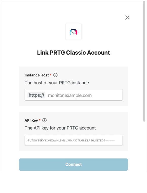 To authenticate with PRTG’s classic HTTP API, you will need:- Instance Host - The host of your PRTG instance.