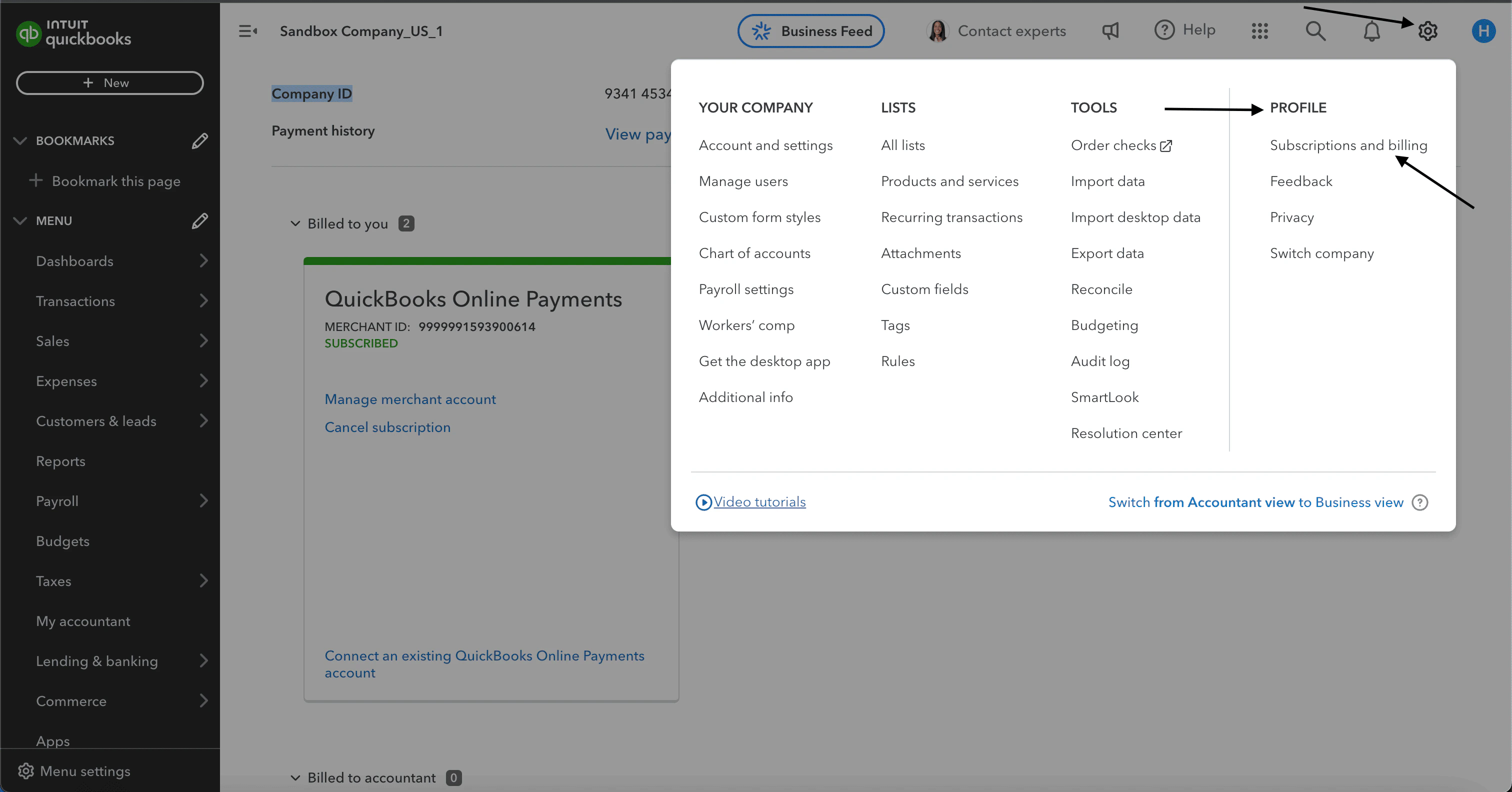 - Click on the settings icon in the top-right corner, then, under PROFILE, click the Subscription and Billing button.