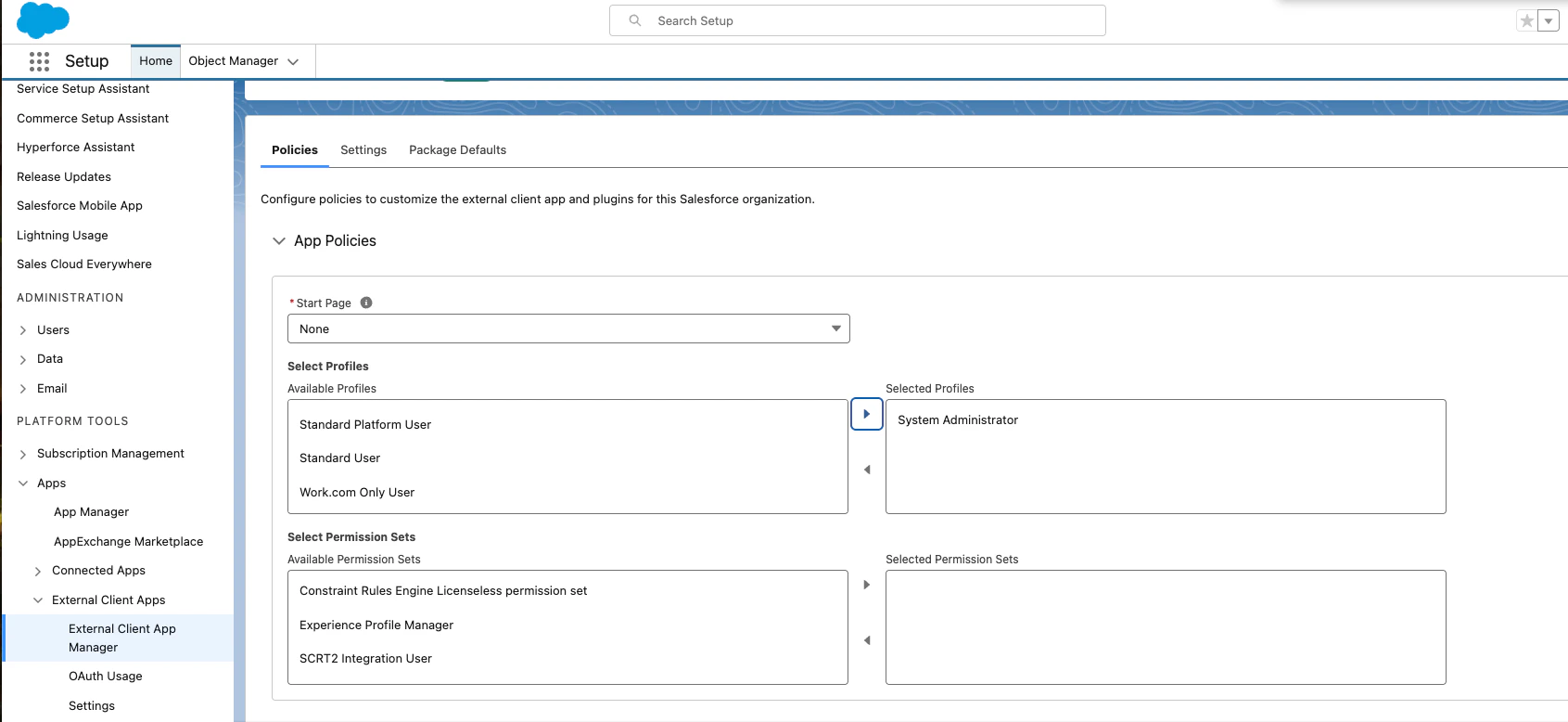 - Go to Setup → Apps → App Manager, then click New External Client App.