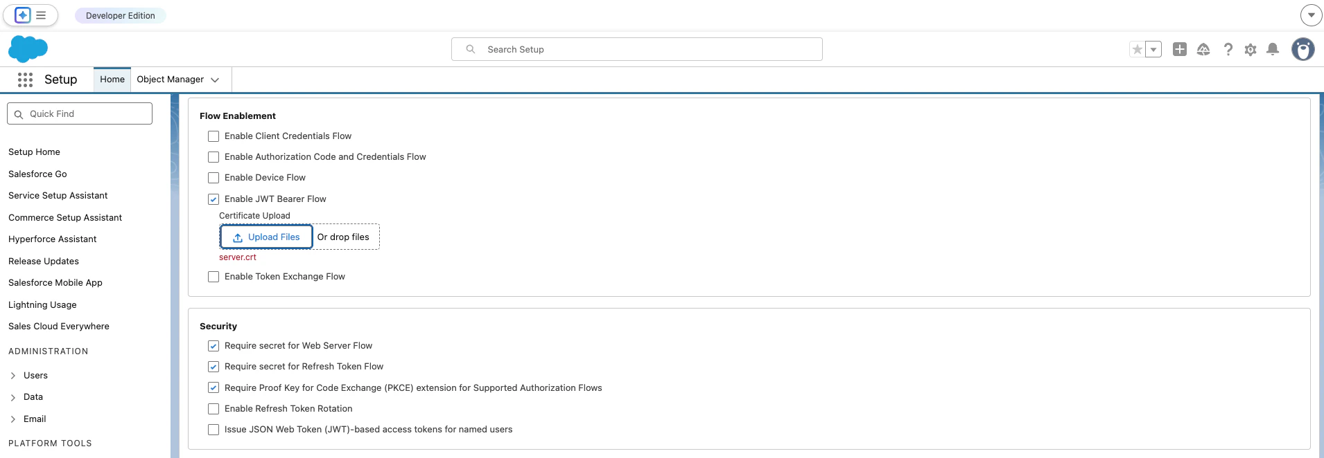- Under Flow Enablement, check Enable JWT Bearer Flow, then click Choose File and upload your certificate file (e.g.