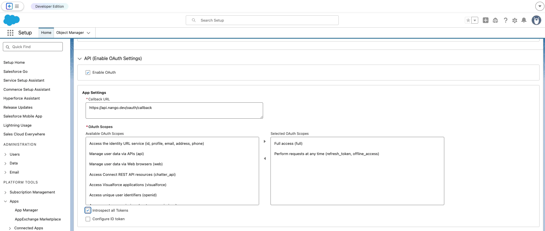 https://api.nango.dev/oauth/callback. Salesforce requires this field even though JWT Bearer Flow does not use it. - Under Selected OAuth Scopes, add: