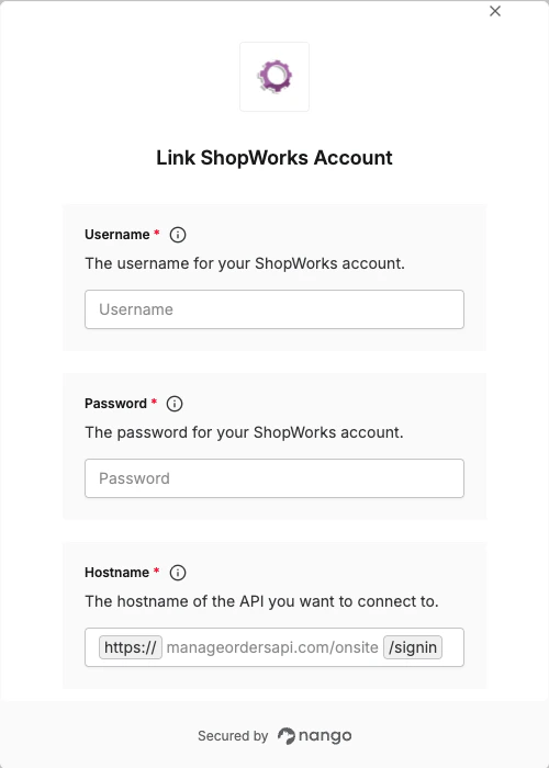 Your ShopWorks credentials are the same username and password you use to log into your ShopWorks account.Step 3: Enter Your Credentials in the Connect UI