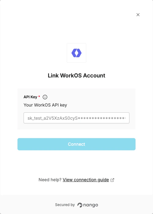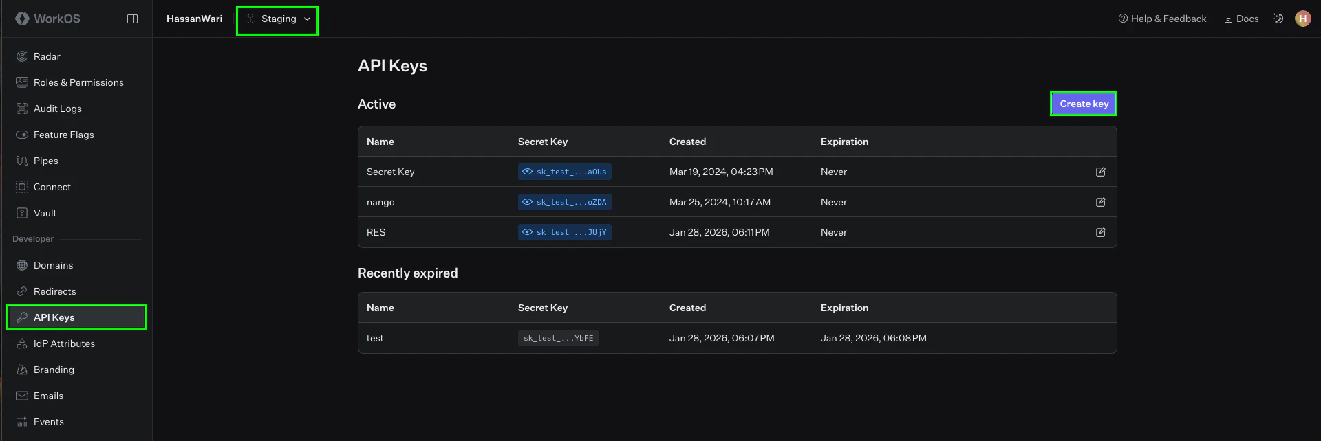 To authenticate with WorkOS, you will need:- API Key - Your WorkOS API key (prefixed with