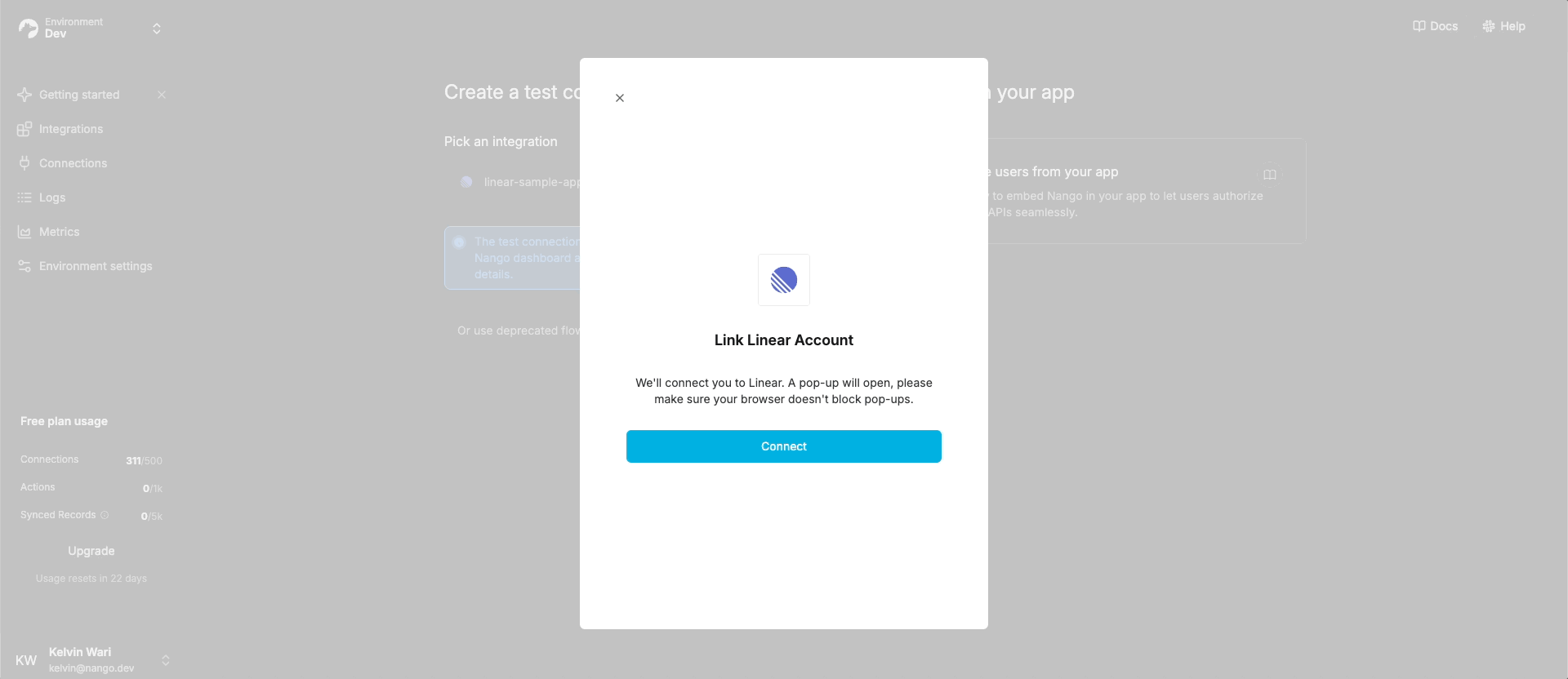 You can now test the authorization flow directly from your app and verify that a connection is created in the Nango UI Connections tab. If an authorization request fails, you can analyze the relevant log in the Logs tab of the Nango UI.5. Setup a custom OAuth callback URL (optional)