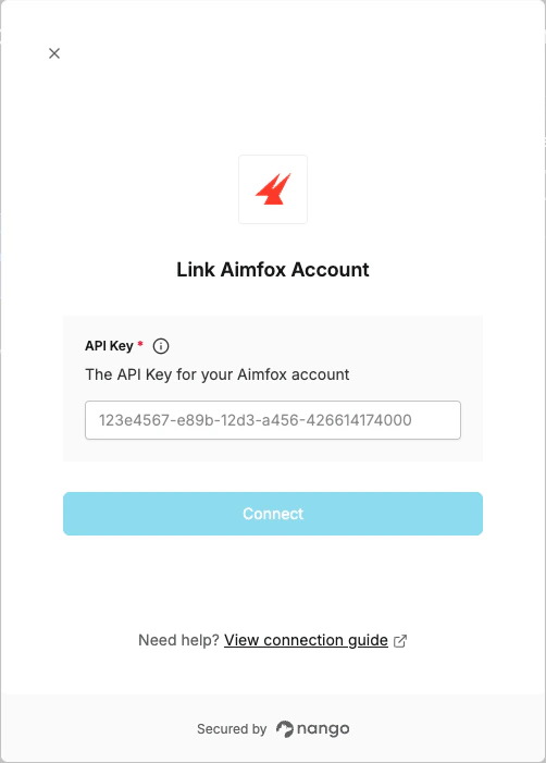To authenticate with Aimfox, you need:- API Key - A key that grants Nango permission to interact with Aimfox’s APIs resources and services.