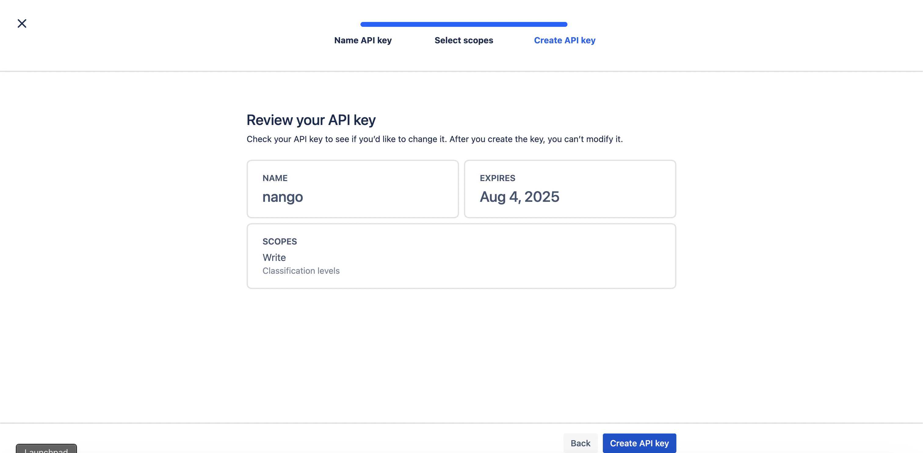 - (For scoped keys only) Under Select scopes, choose the appropriate permissions for your use case.
