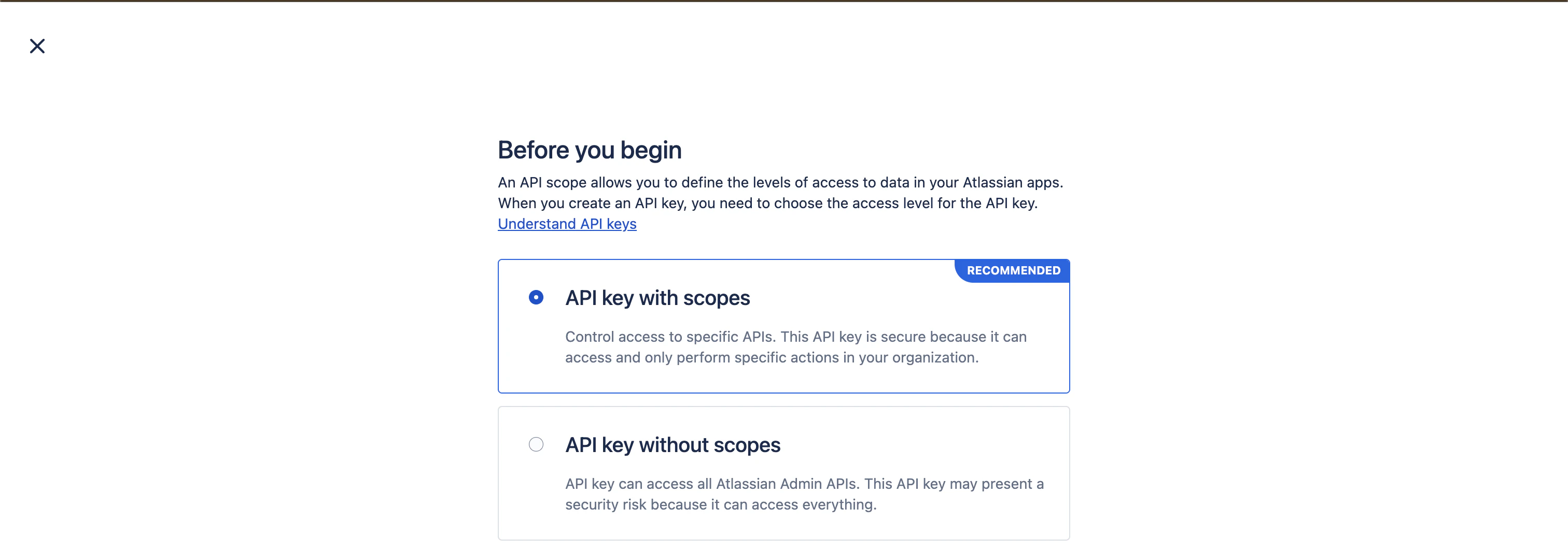 - To authenticate with Atlassian Cloud Admin APIs, you’ll need to generate an API key. You can choose between: