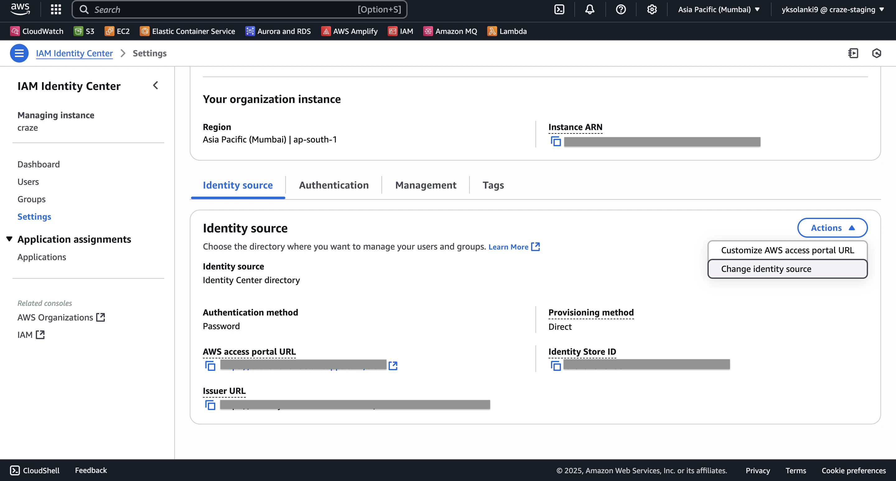 - In the Identity Source tab, click on Actions > Change identity source