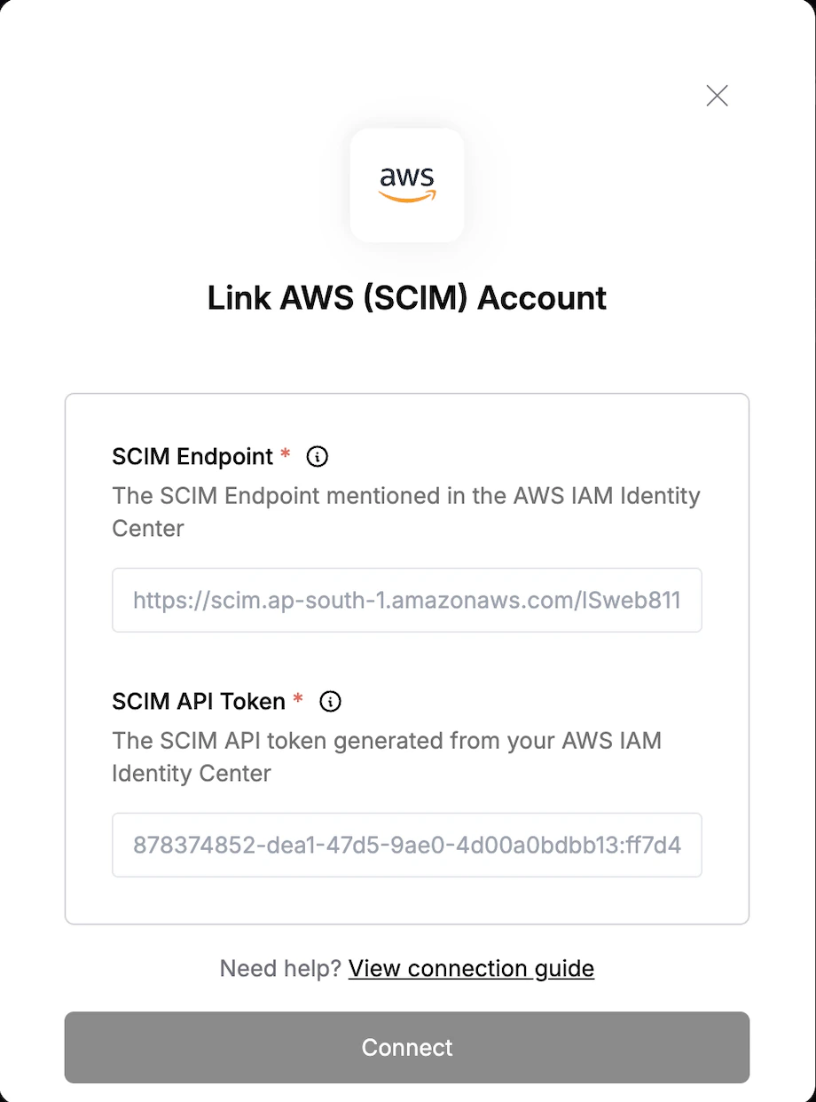 To authenticate with AWS SCIM, you need two key pieces of information:- SCIM API Token - A token generated from your AWS IAM Identity Center to authenticate SCIM requests.