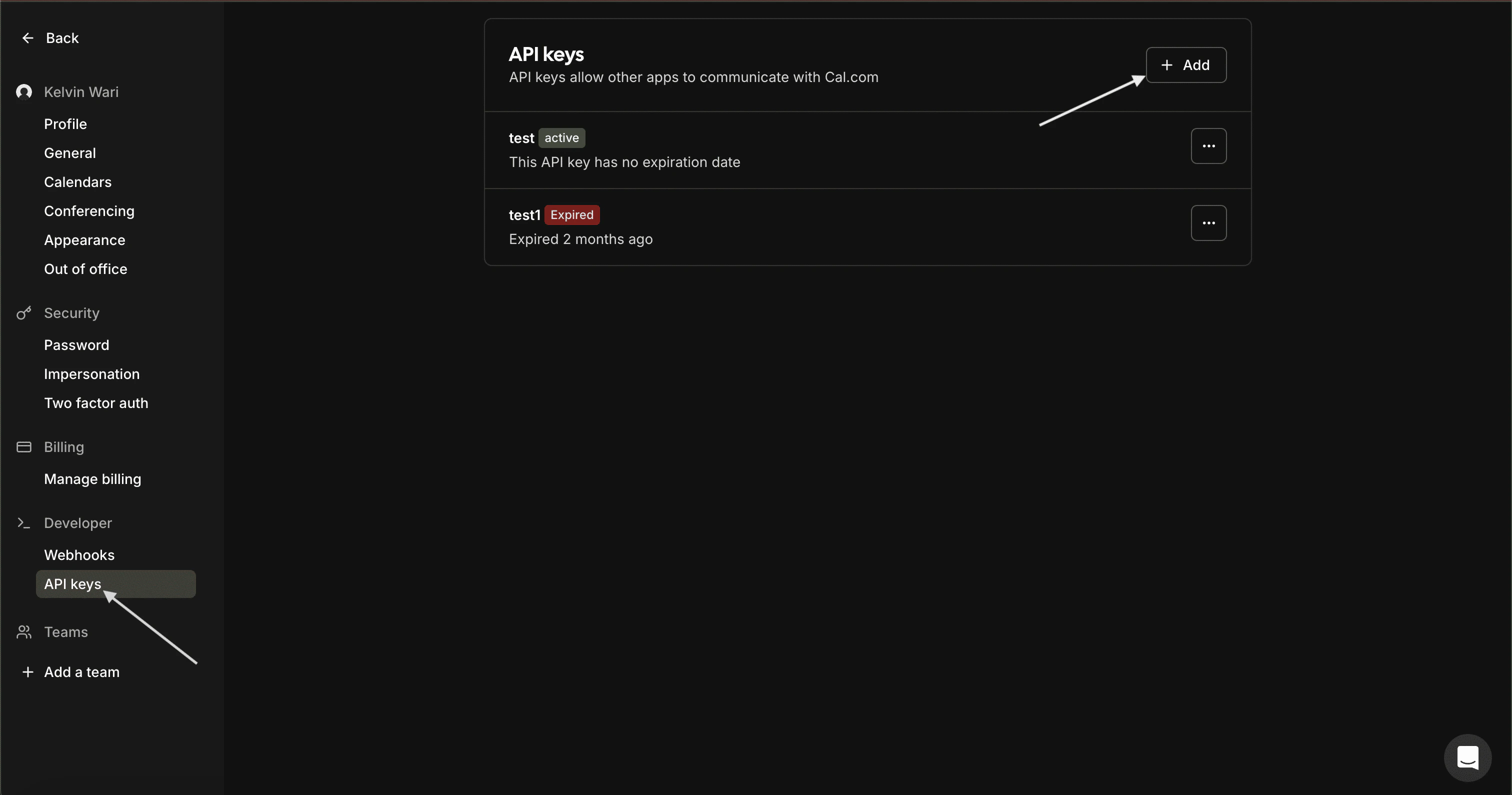 - In your API Keys page, click the Add button to add a new API Key. A form will appear where you’ll need to provide a Name and set key expiration duration. Once you save these details, an API Key will be generated.