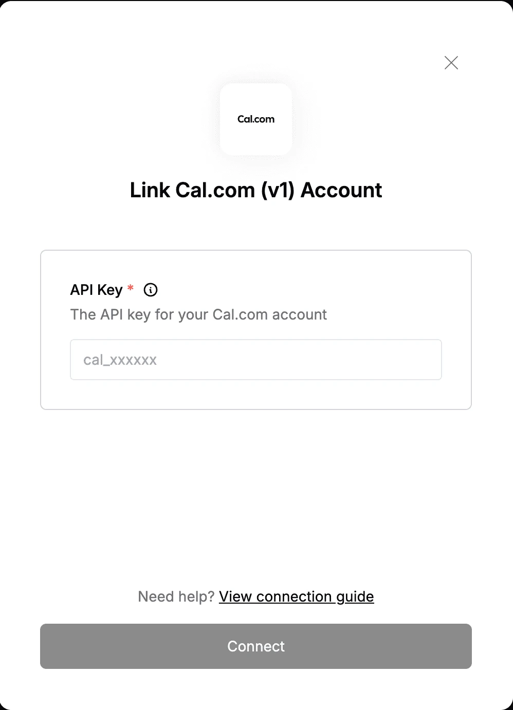 To authenticate with Cal.com (v1), you will need:- API Key - A key that grants Nango permission to interact with Cal.com’s (v1) APIs resources and services.