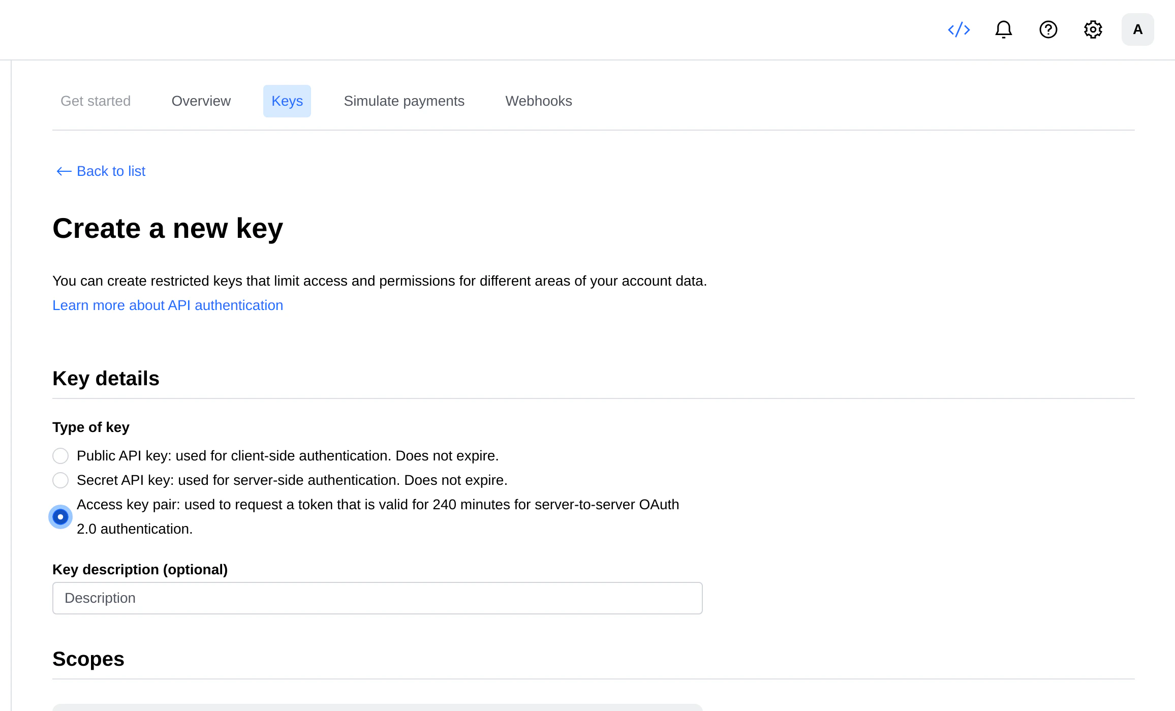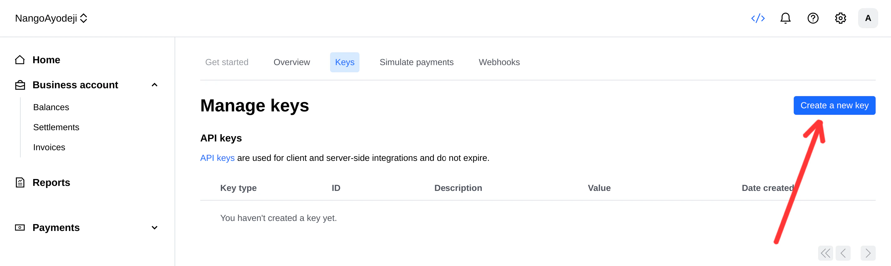 - Click on the Create a new key button