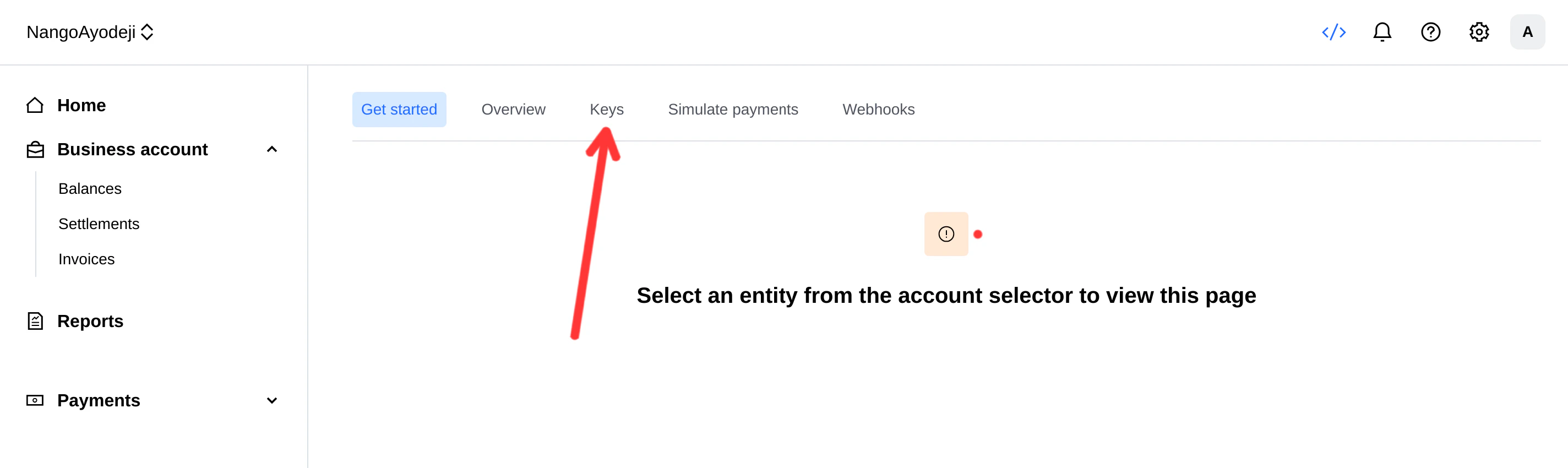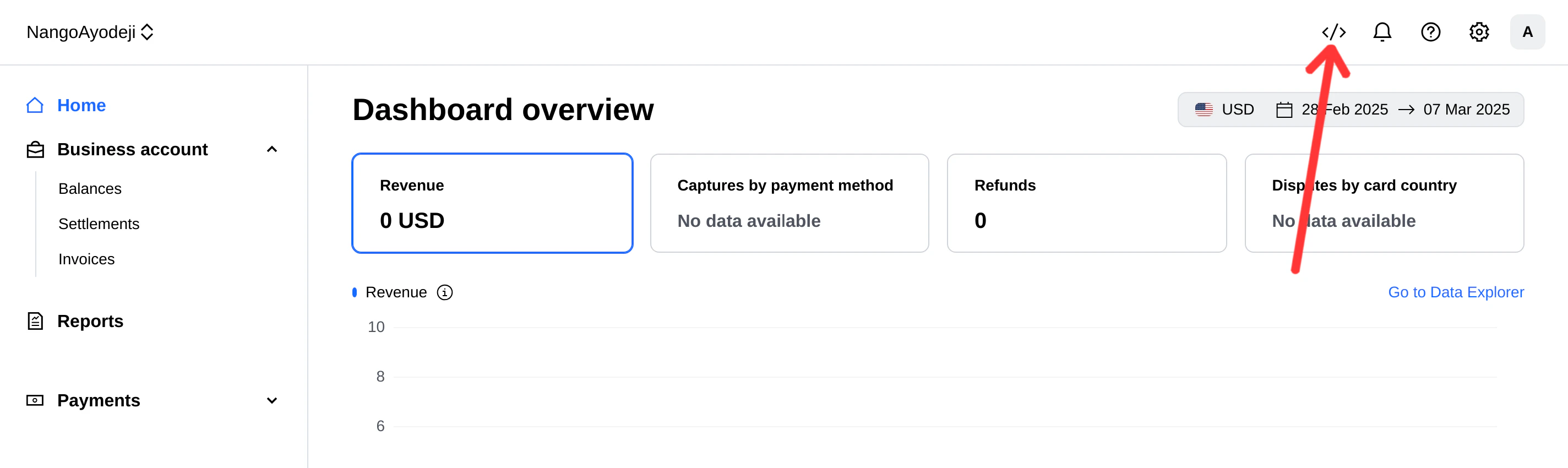 - From your Checkout sandbox dashboard, click on the Developer icon at the top right corner of the screen.