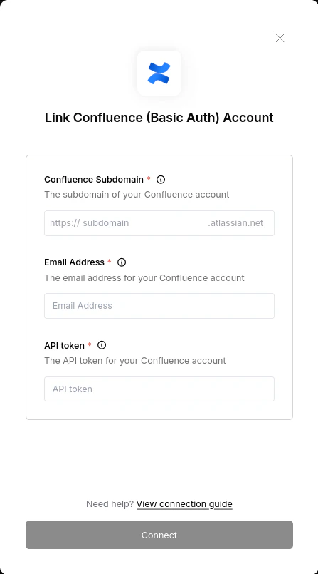 To authenticate with Confluence’s REST APIs using Basic Authentication, you need:- Email Address - Your Atlassian account email address
