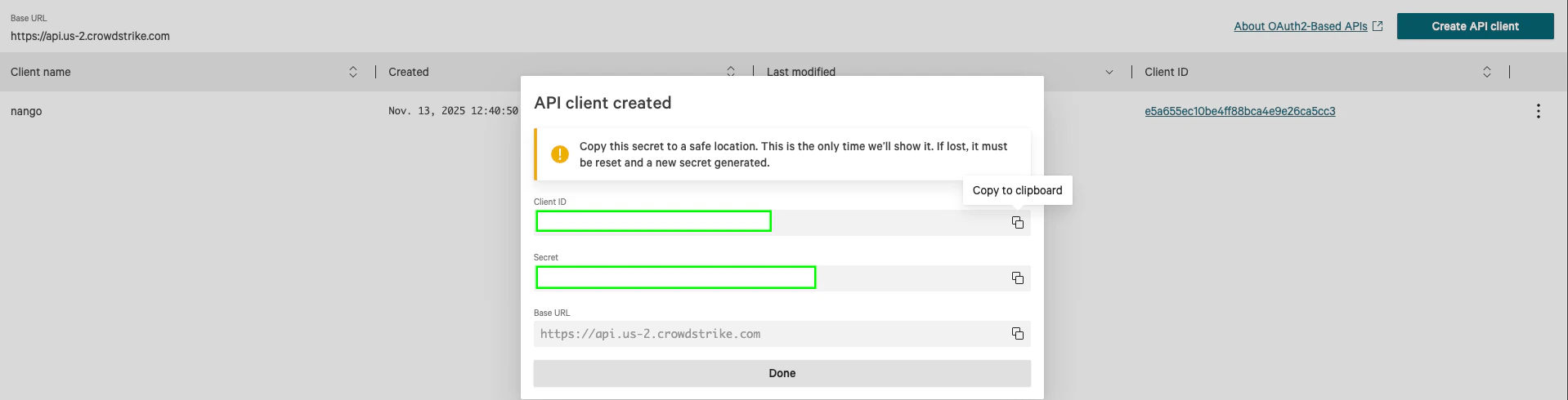 To authenticate with CrowdStrike, you need:- Client ID - A unique identifier for your API client.