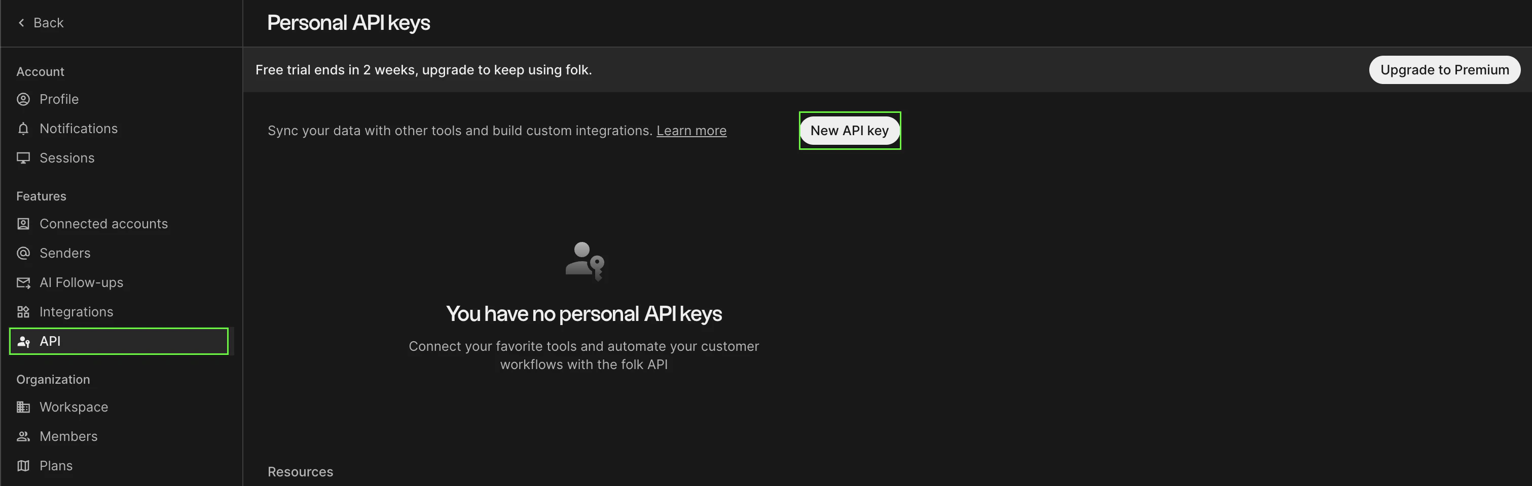 To authenticate with Folk, you need:- API Key - A key that grants Nango permission to interact with Folk’s API.