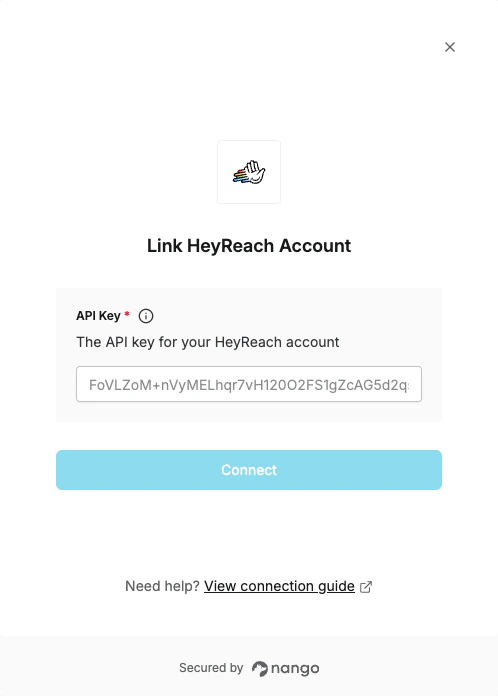 To authenticate with HeyReach, you need:- API Key - A key that grants Nango permission to interact with the HeyReach API.