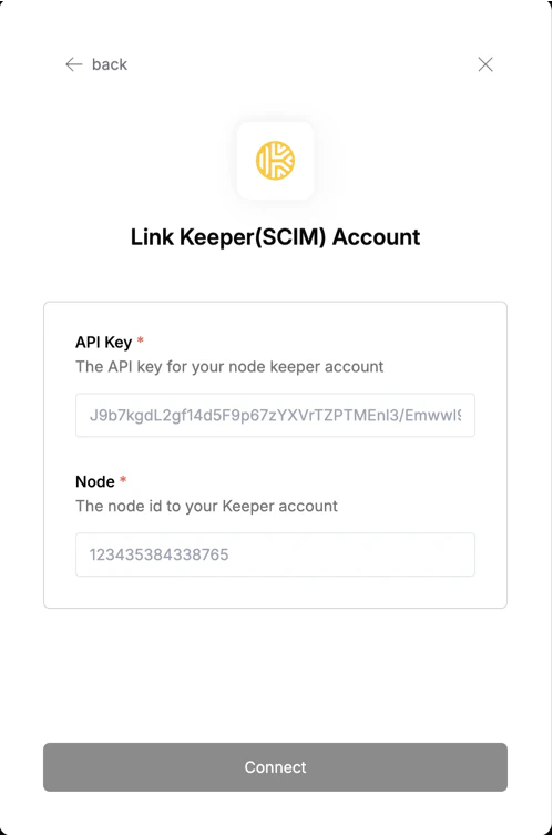 - Node: The node id coresponding to the API Key. Click “Connect” to complete the authentication.