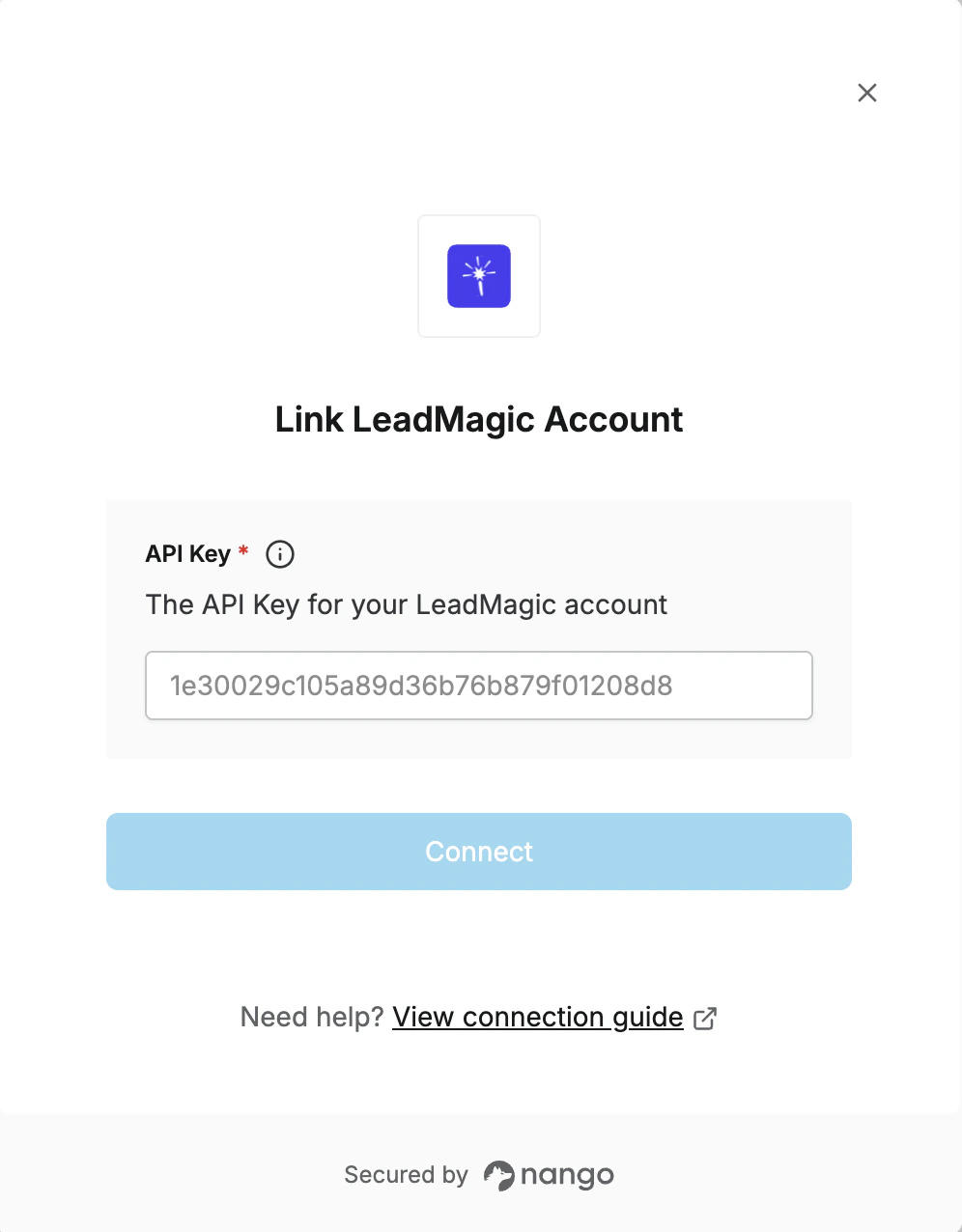 To authenticate with LeadMagic, you will need:- API Key - A key that grants Nango permission to interact with LeadMagic’s API resources and services.