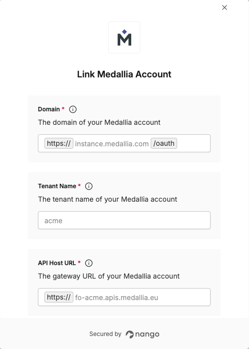 https://<company>.apis.medallia.<tld> are deprecated and only valid for legacy clients. Step 5: Enter credentials in the Connect UI