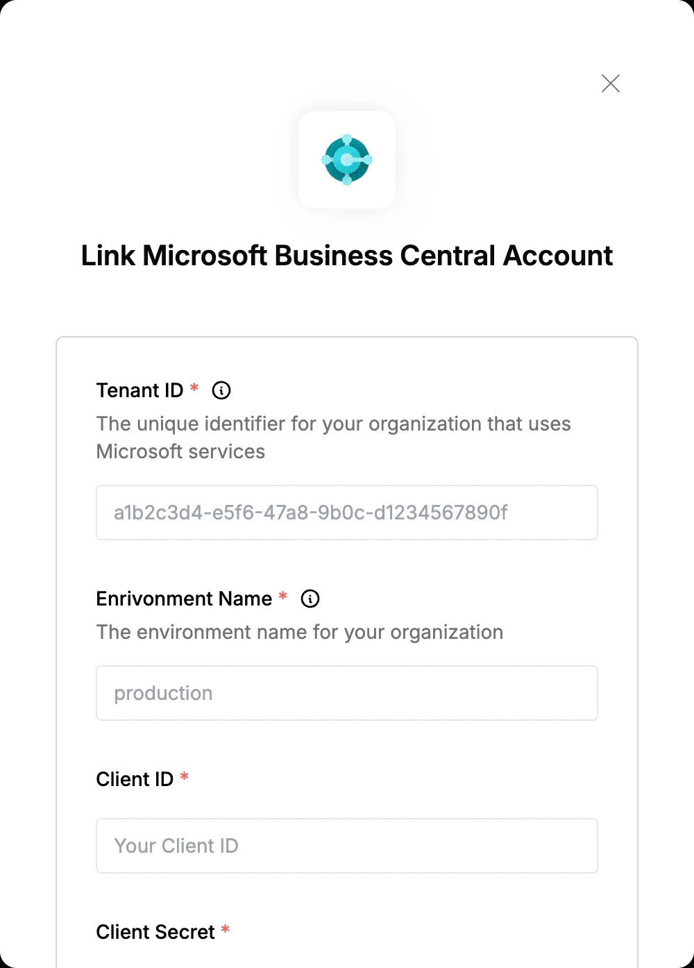 To authenticate with Microsoft Business Central, you need:- Tenant ID - The unique identifier for your organization that uses Microsoft services.