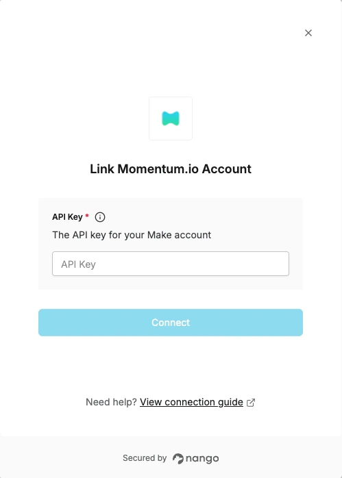To authenticate with Momentum.io, you will need:- API Key - A key that grants Nango permission to interact with Momentum.io’s API resources and services.