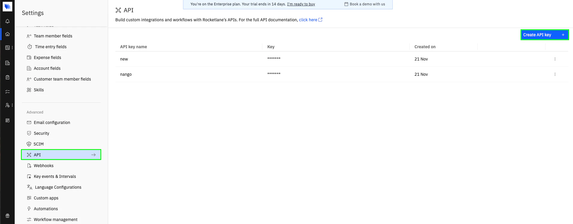 - You must have a registered Rocketlane account with permission to generate an API Key.