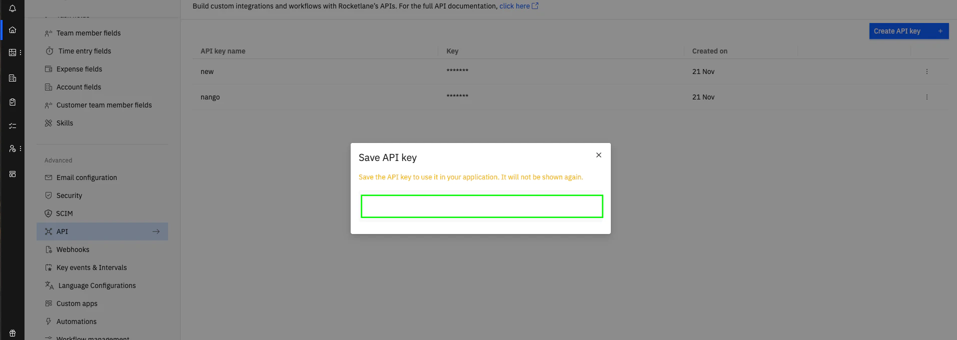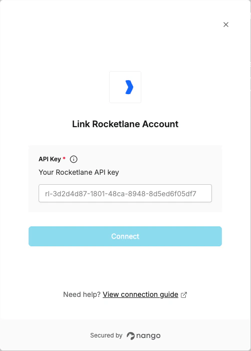 To authenticate with Rocketlane, you will need:- API Key — A key that grants Nango permission to interact with Rocketlane’s API resources and services.