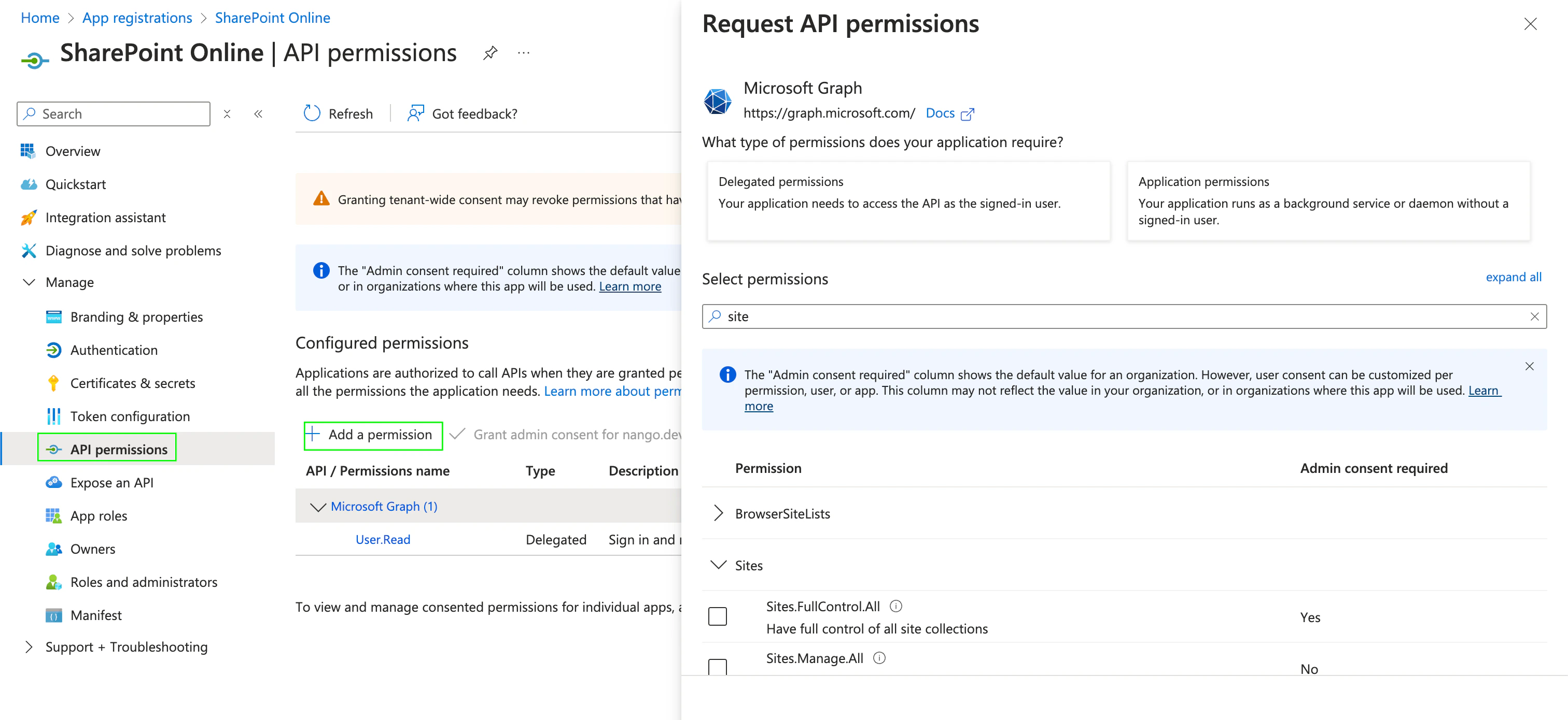 - After generating the Client Secret, you must grant the registered application the necessary permissions for SharePoint Online. To do this, navigate to API permissions, select Add a permission, and choose Microsoft Graph.
