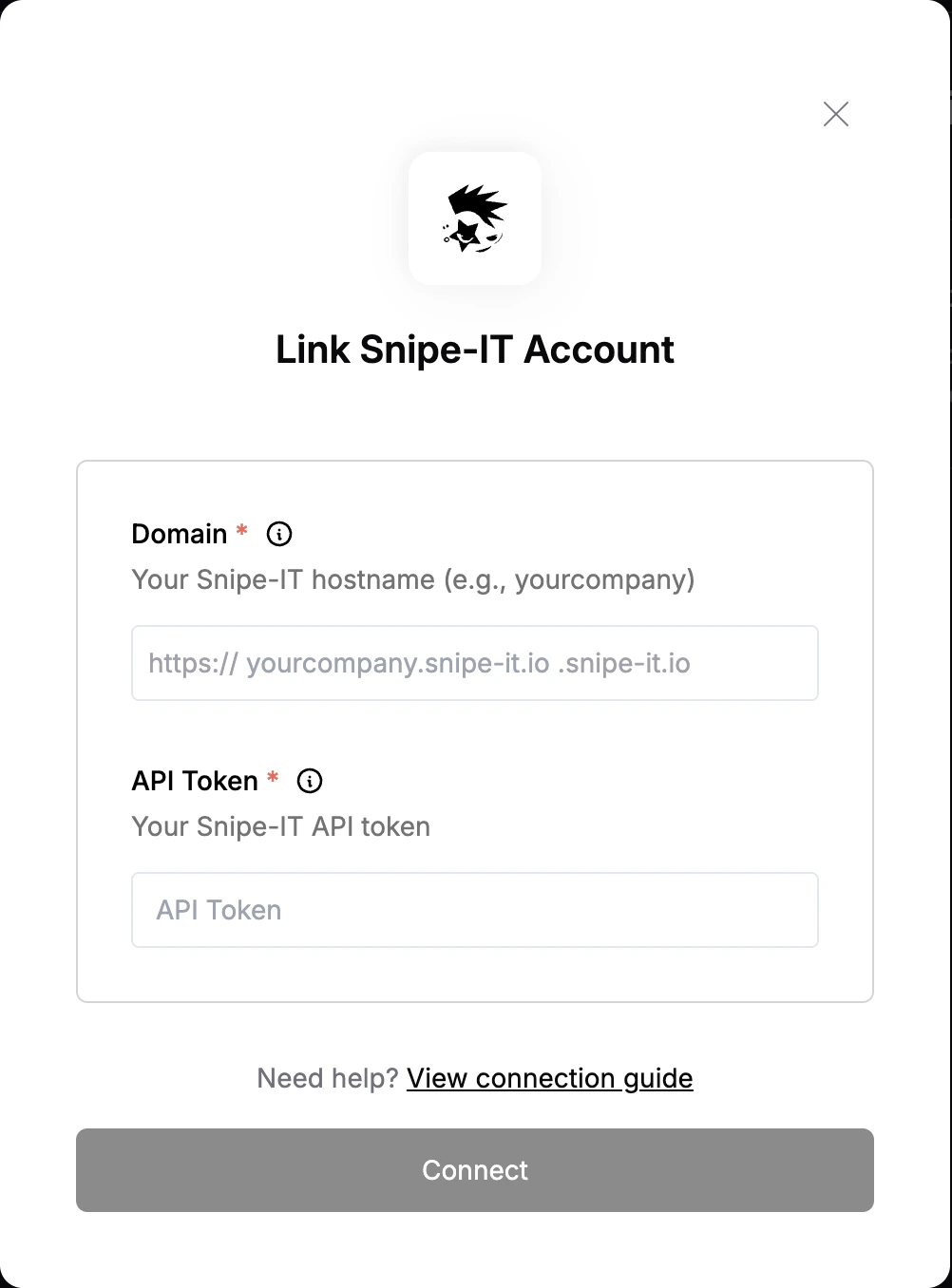 - Domain - Your Snipe-IT instance URL (e.g., yourcompany.snipe-it.io).