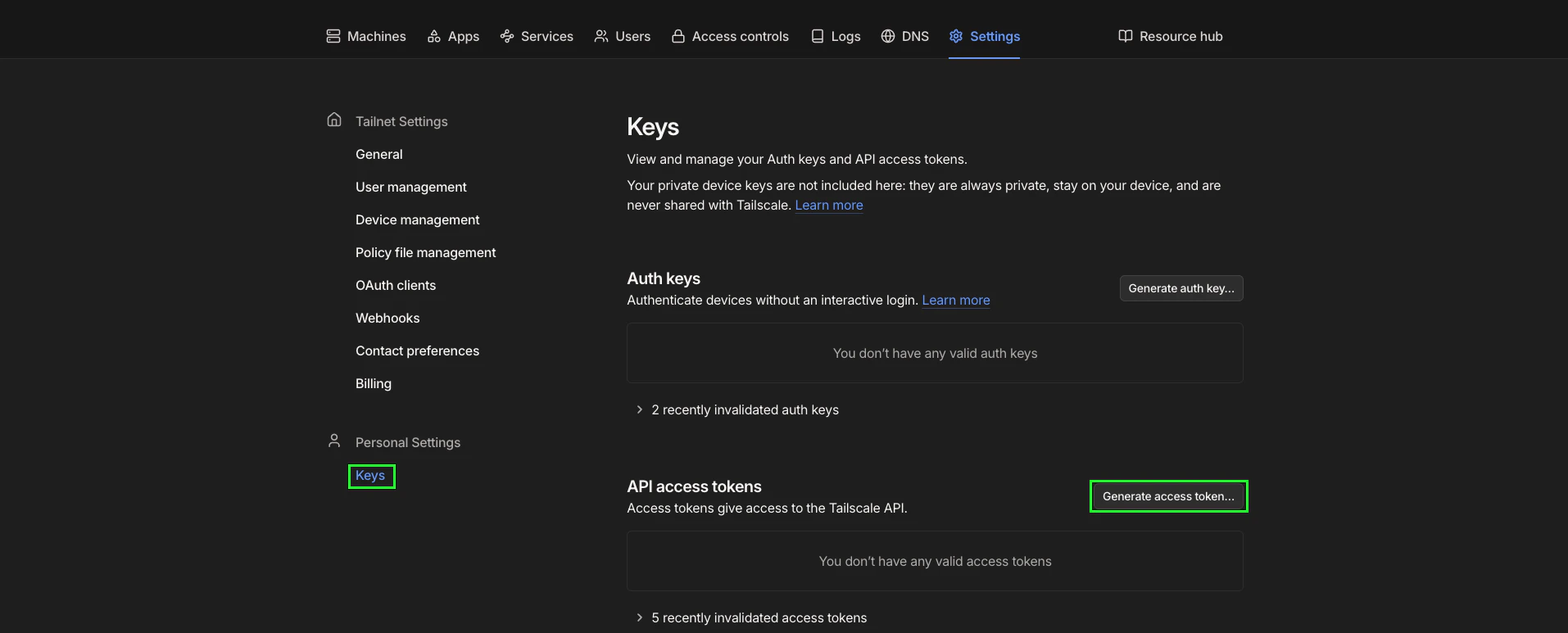 - In the Tailscale admin console, navigate to the Keys page.