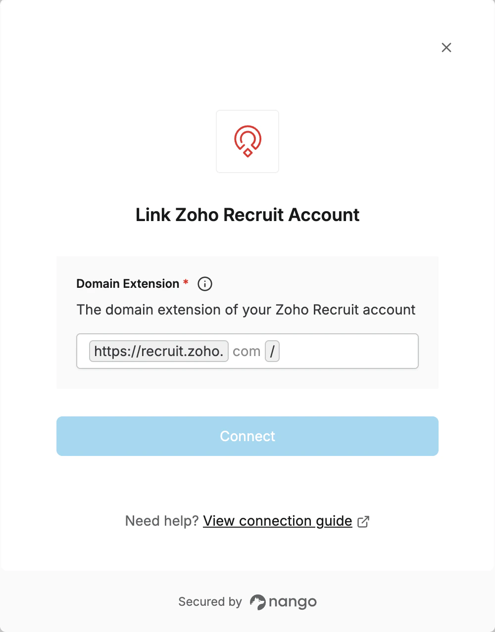 To authenticate with Zoho Recruit, you need:- Domain Extension - This extension indicates the data center where your account is hosted.